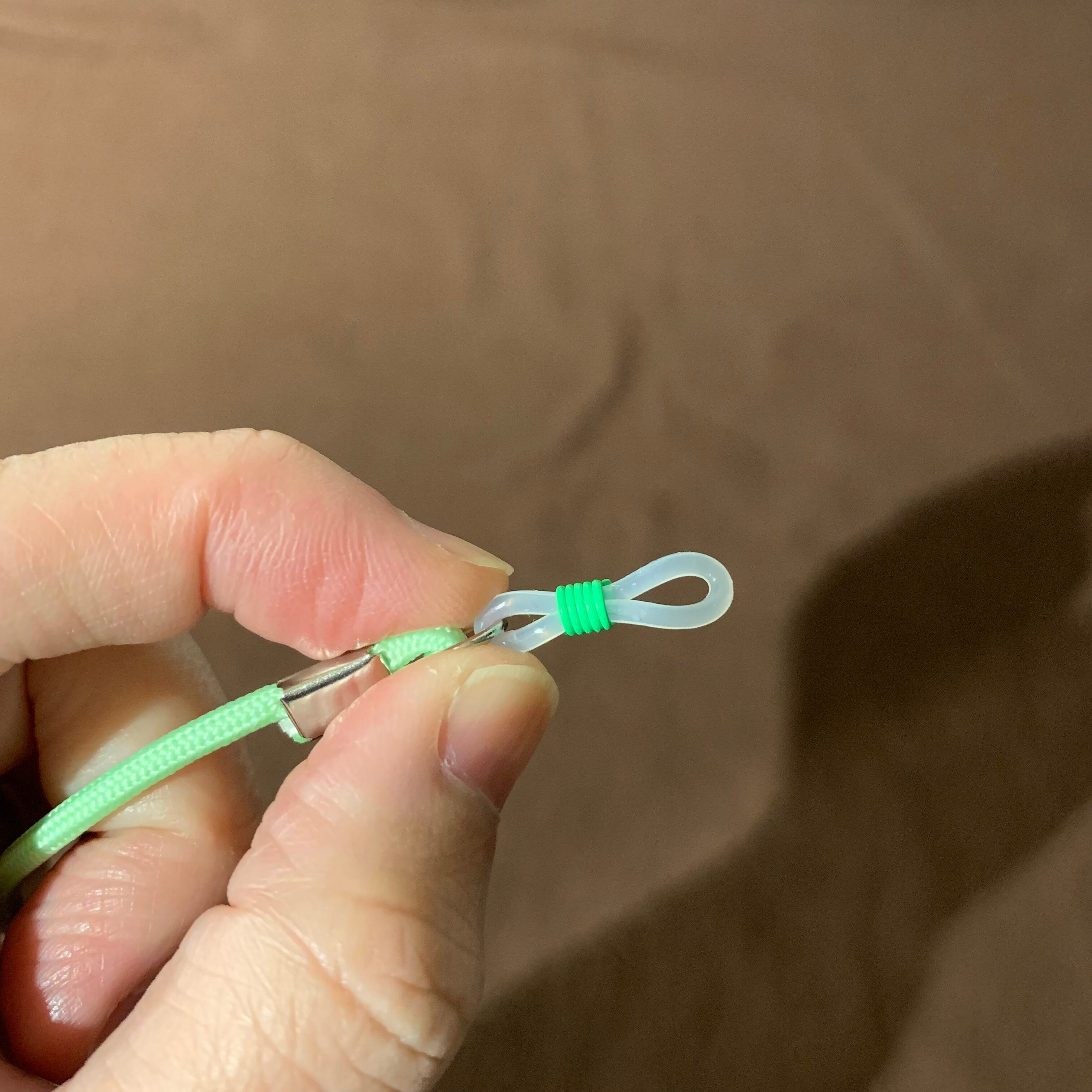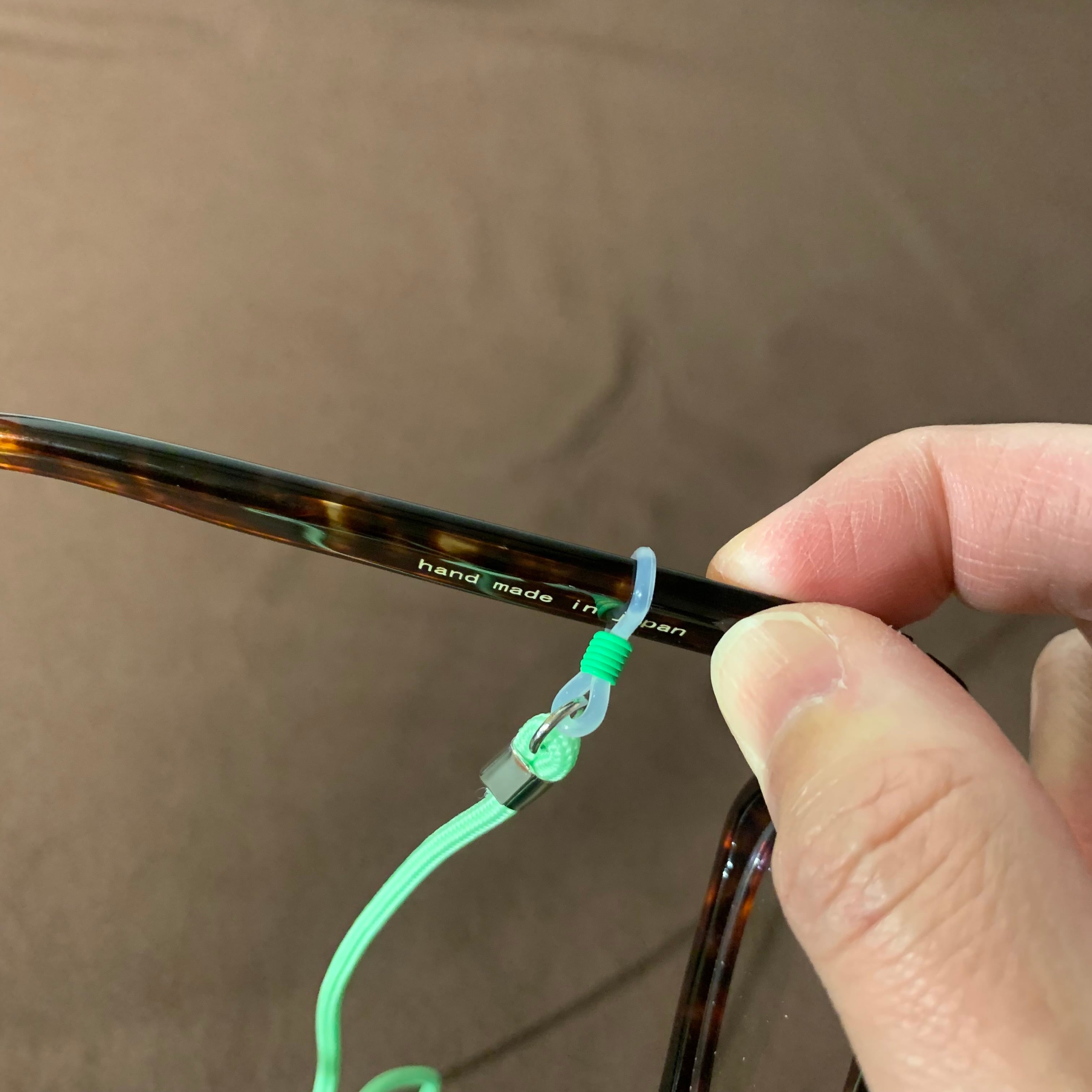 シリコン部分を引っ張ってメガネに装着して