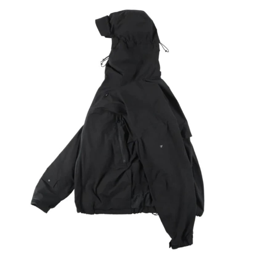フードは大きく設定、更にゴムひもで